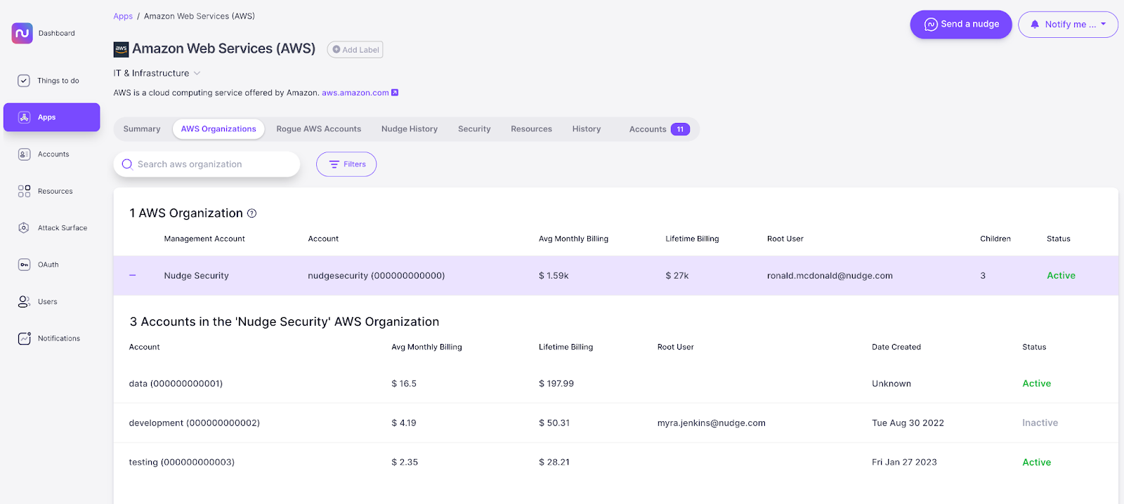 You can see a full list of your AWS Organizations, with the accounts associated with each AWS Organization nested underneath for easy navigation.