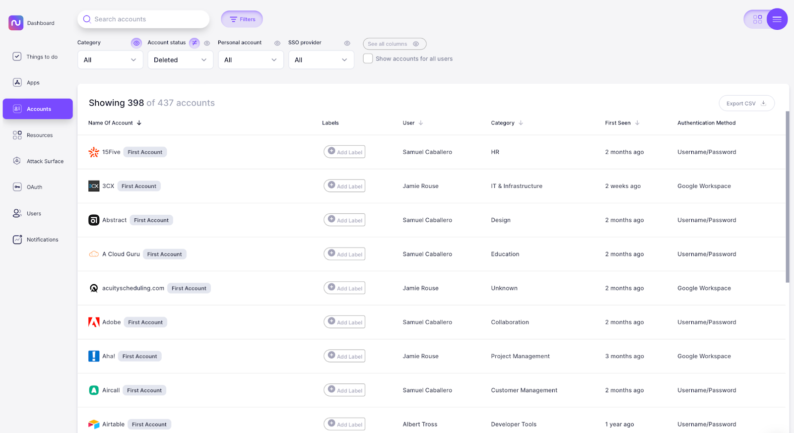 We've added a new filter to help you view your employees' accounts by authentication type to see how they're accessing different apps. For example, you might want to look at all accounts created with a username and password, meaning the logins aren't unmanaged by your organization. You can also filter by authentication methods such as Okta, Azure, Google Workspace, Slack, Office, and Github.
