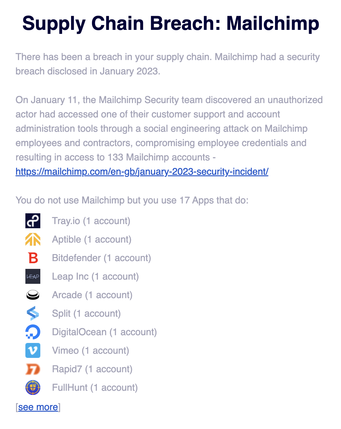 When a data breach disclosure is discovered for a third- or fourth-party SaaS provider in your SaaS supply chain, Nudge Security will send you an email notification, alerting you to the potential impact of the breach. Here’s a recent example we sent to customers: