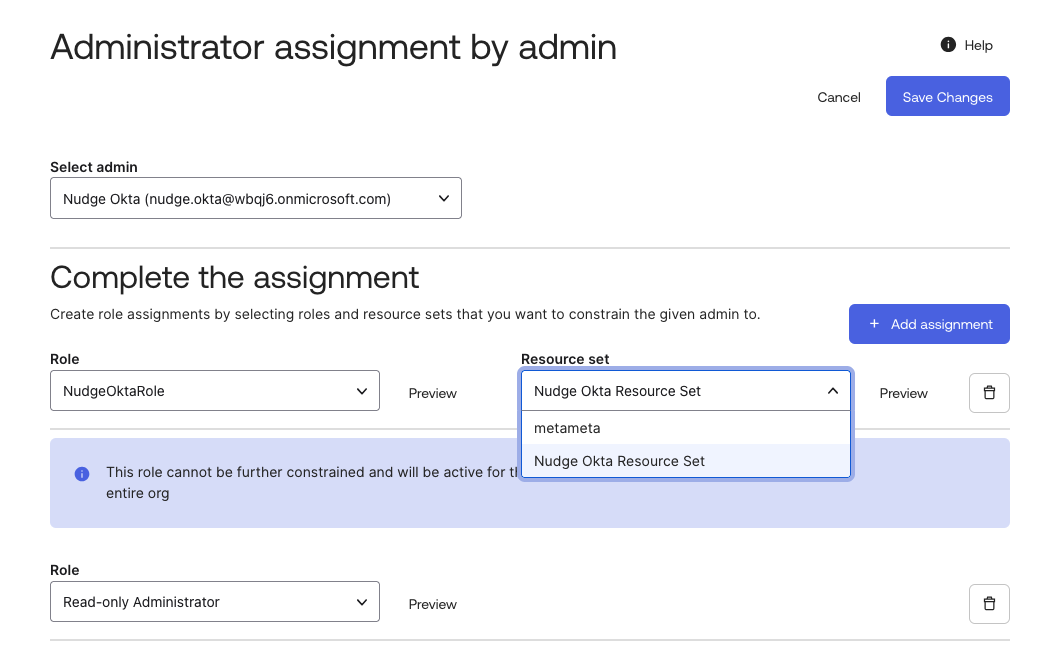 Under Role, select the custom role, and under Resource Set, choose the resource set you established.