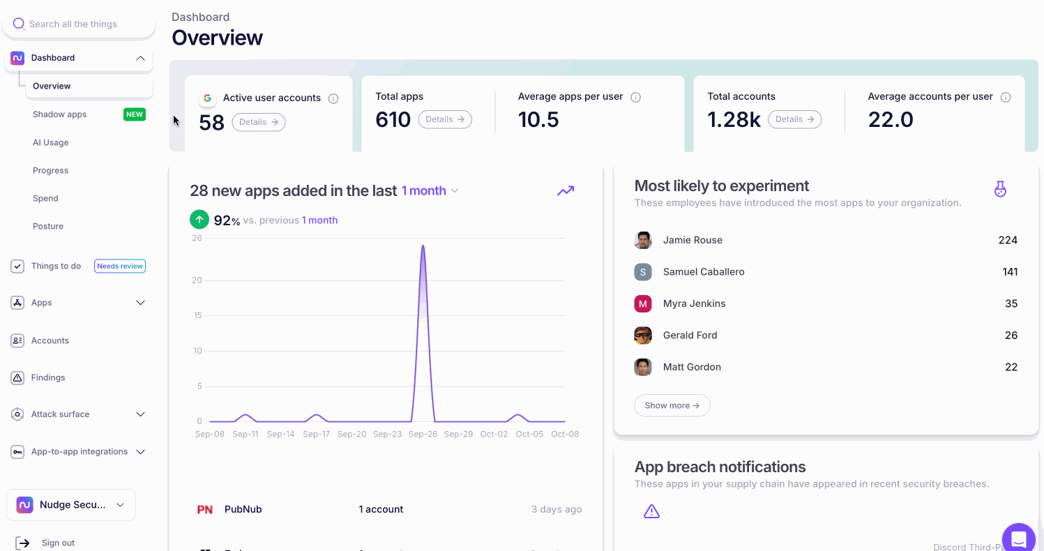 The App Directory in Nudge Security is your organization’s trusted hub for finding and accessing approved software and services. Instead of guessing whether an app is safe or manually requesting access, employees can quickly check the App Directory to see what tools are centrally managed, secure, and ready to use.