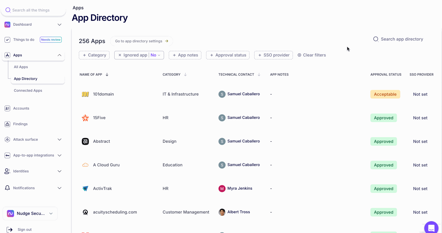 The App Directory in Nudge Security is your organization’s trusted hub for finding and accessing approved software and services. Instead of guessing whether an app is safe or manually requesting access, you can quickly check the App Directory to see what tools are centrally managed, secure, and ready to use. Once you request access to an app you'll send a nudge to the technical contact for the app who will review your request and decide to give you access to the app.