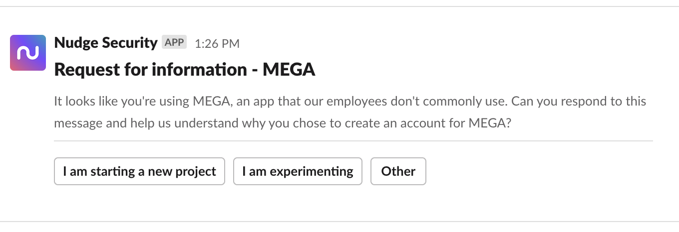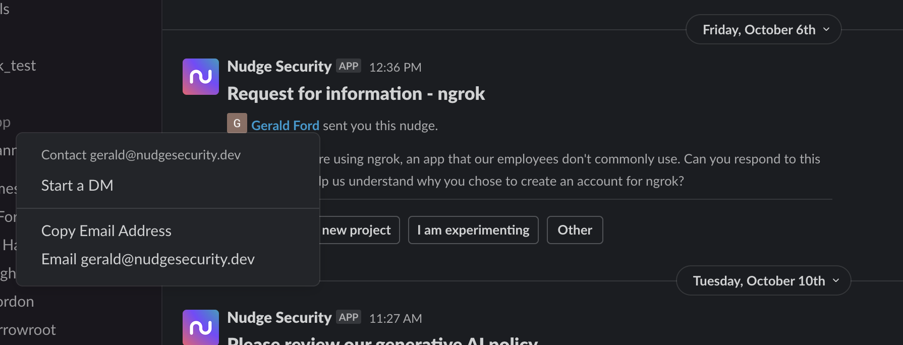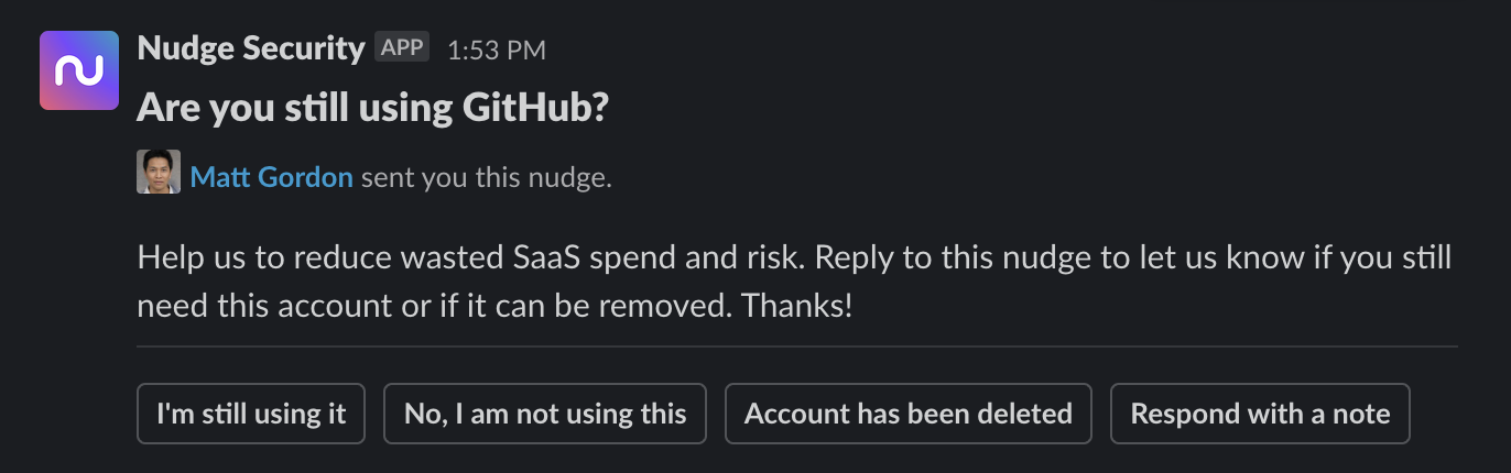 You also have the ability to send/receive Nudges via Slack and they work very similar to a Nudge via email. You will receive Nudges from the "Nudge Security" bot for Slack and the messages will be displayed like so: