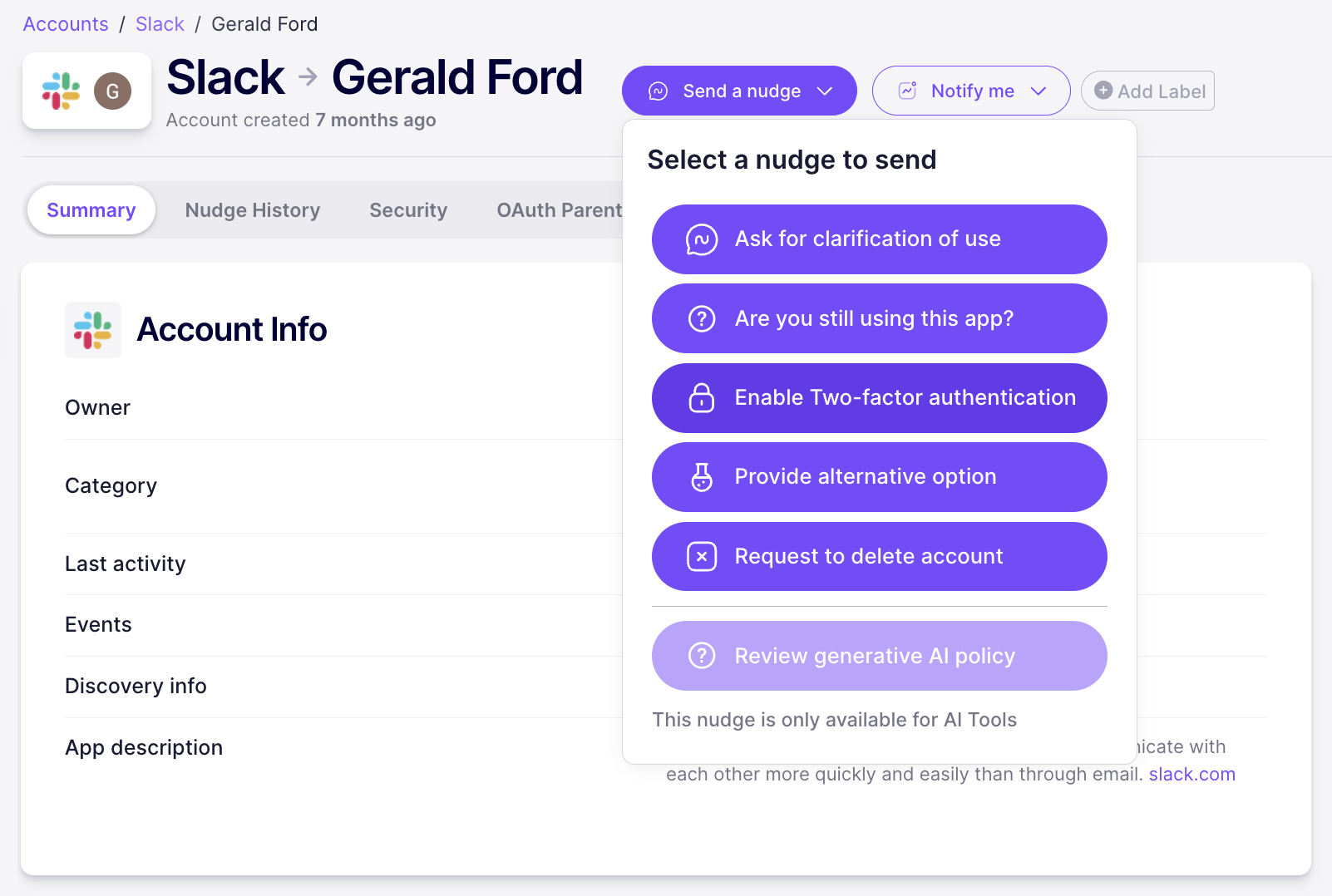 There are many ways to send a Nudge but the first spot to try it out might be from one of our application summary pages. In the screenshot below, I am looking at the Slack account for the user "Gerald Ford".