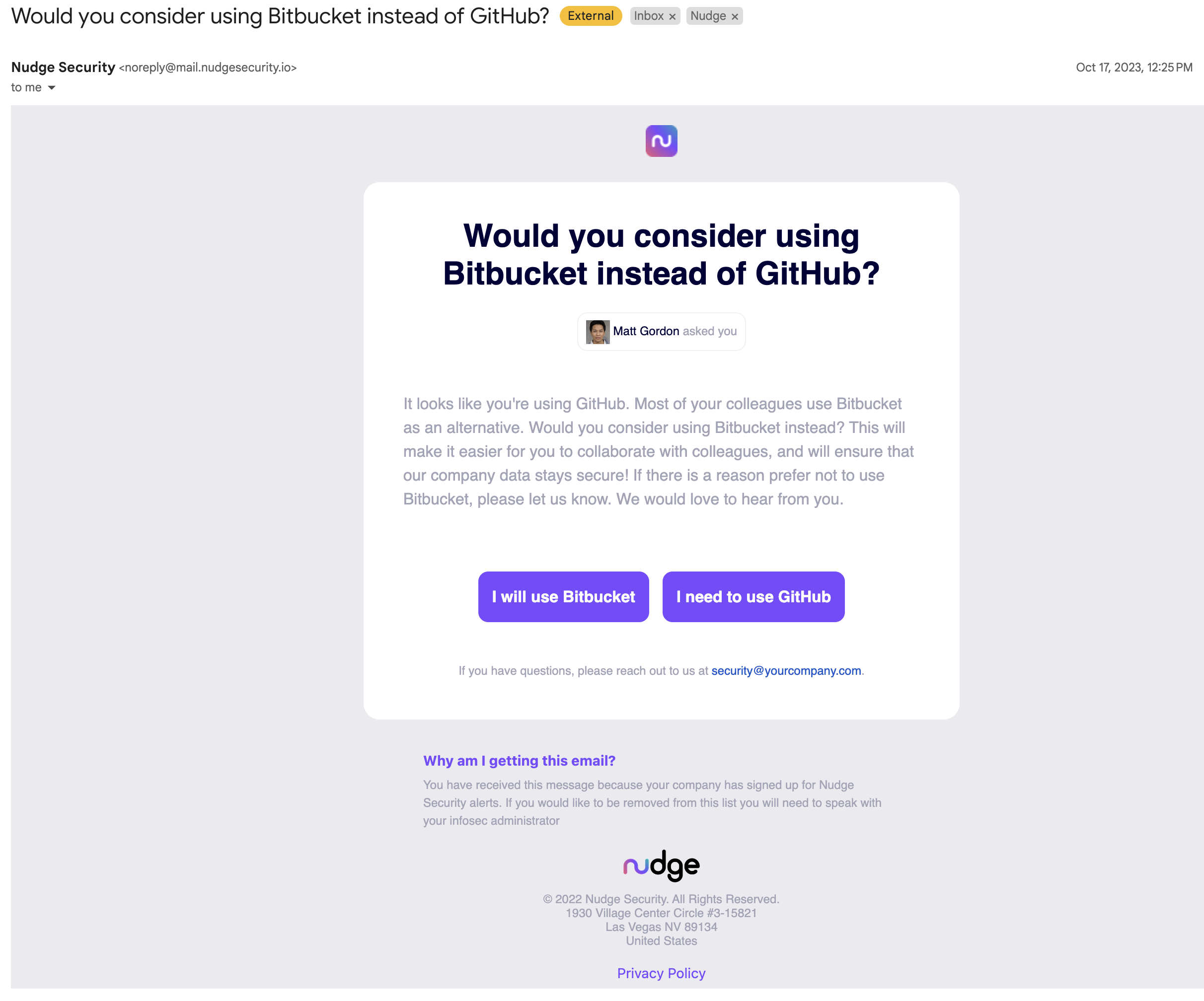 Nudges, by default, are delivered via email. You will receive a message from "noreply@mail.nudgesecurity.io" with a subject line describing what it is about (e.g. "Would you consider using Bitbucket instead of GitHub?").