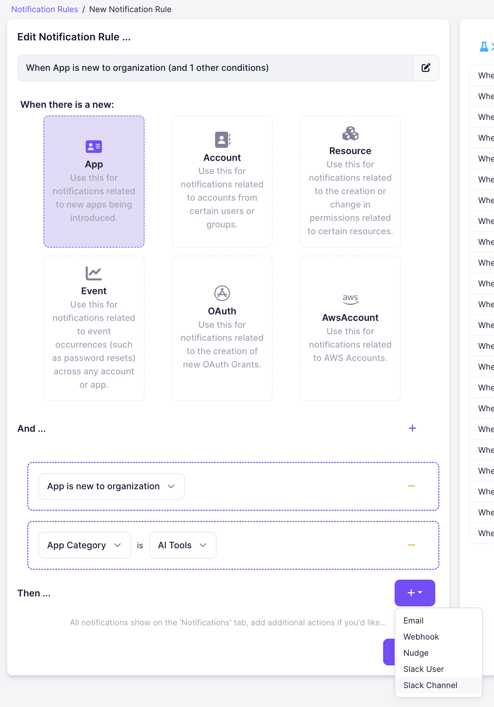 With Nudge, you are able to set up workflows to notify when certain events happen and/or take action as a result. One of the options available when any condition is met is to send a notification to a Slack channel.
