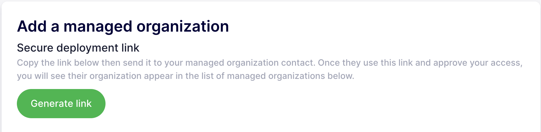 Click “Generate link” and a custom (unique to you) link will be generated. Copy this link to deploy your customer’s instance. Note that this link is good for 14 days and will expire afterwards. At any time, you can regenerate a new link, rendering any prior links unusable. Any customer instances created with the links prior to their revocation will not be affected.