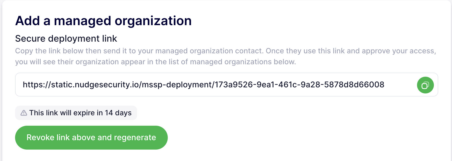 💡 Note: A 12 month license is automatically created when this link is used to deploy to your customer’s account. If you or your customer would like to evaluate Nudge beforehand, they will (or you on their behalf) need to deploy a trial using the standard link (nudgesecurity.io/login). Once the evaluation is complete, you can use your “secure deployment” link to associate their instance with yours and establish remote management. This will also create a 12 month license for them at that time.