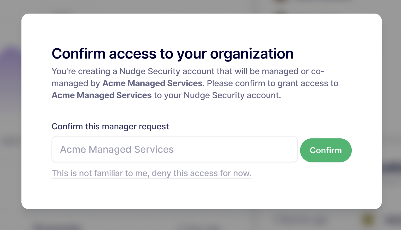 If you don’t have a Nudge Security account for your managed services organization, you’ll need to create one first. It takes just a few minutes to set up.