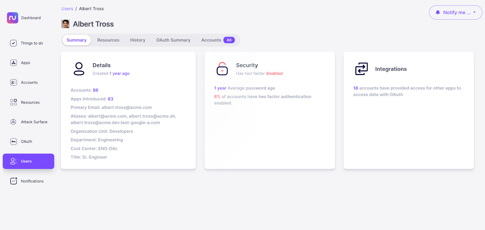 Now, you can filter accounts by MFA status to surface and prioritize enrollment gaps. You can also filter accounts and OAuth grants based on categories such as organizational unit, department, division, location, and cost center, which are fields set within Google Workspace or Microsoft 365.