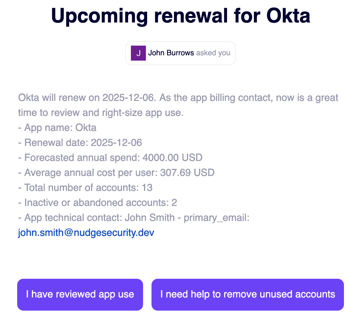 Keeping your billing contacts informed about upcoming subscription renewals is an important part of managing your SaaS environment. Nudge Security lets you configure notification rules to automatically alert key stakeholders when a renewal is coming up, so nothing falls through the cracks.