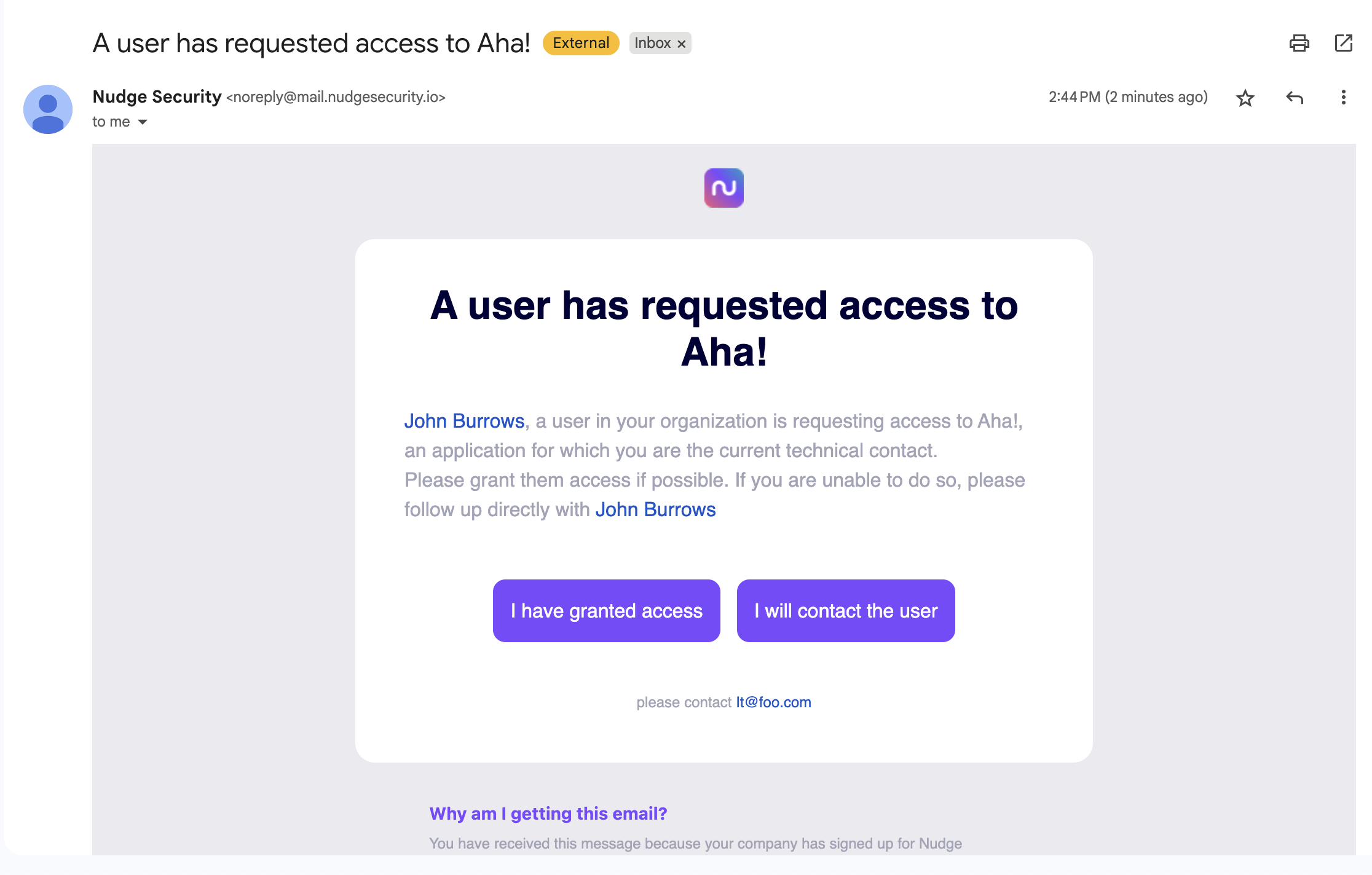 This is what the nudge for the technical contact looks like. The technical contact will be able to either grant access and reply back to the nudge informing you and the user who requested access that they have granted access or choose to contact the user directly if they cannot grant app access.