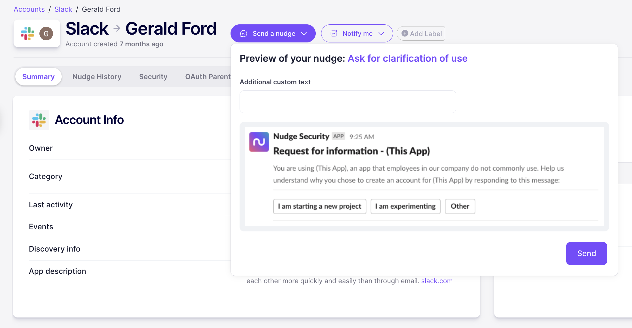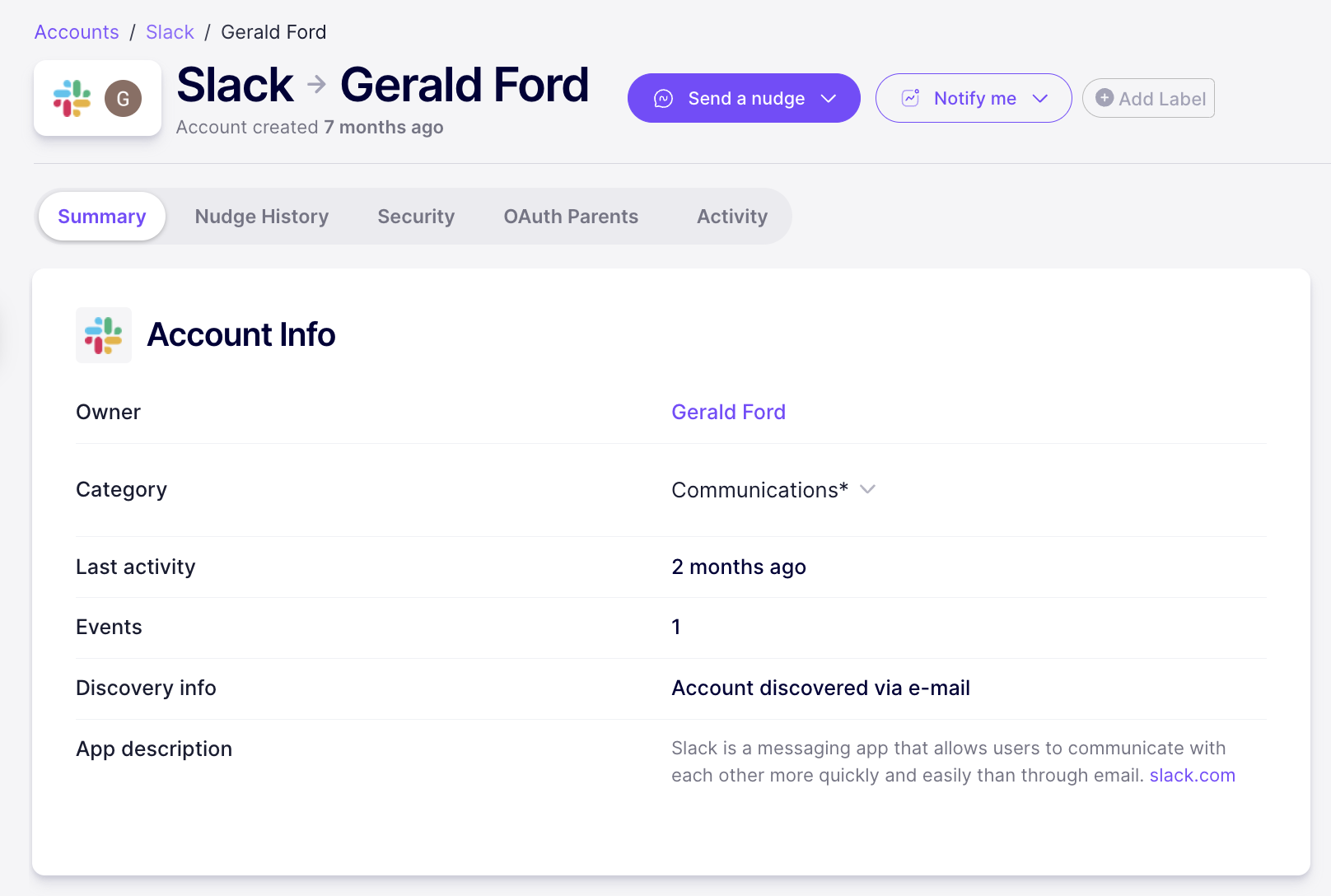 There are many ways to send a Nudge but the first spot to try it out might be from one of our application summary pages. In the screenshot below, I am looking at the Slack account for the user "Gerald Ford".